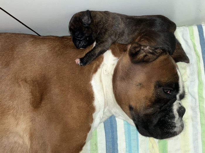 Kaum fertig ‘kontrolliert‘ Kiki, ob auch alles mit Bett & Welpen in Ordnung ist und die Zwerge urgieren ihr zweites Frühstück!
